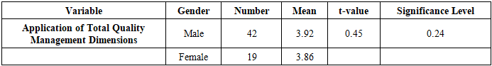 Main hypothesis: There is a statistically significant positive relationship between TQM application and financial performance in small companies.Statistical analysis revealed a positive correlation between the combined TQM dimensions (budget review, setting and analyzing indicators, evaluating and correcting deviations) and financial performance. Correlation coefficient=0.798 at a significance level of 0.000. The coefficient of determination is 0.637 which means that 63.7% of the change in financial performance is explained by TQM dimensions. Effect size B=0.798 F-value =103.63.This confirms that the implementation of TQM increases financial performance through increased production and reduced costs, hence supporting the main hypothesis.Sub-hypothesis 1: There is a statistically significant positive relationship between budget review and financial performance.The results indicated a positive significant correlation between firms’ commitment toward reviewing budgets and financial performance (r = 0.59, Sig = 0.000). This finding supports sub-hypothesis 1.Sub-hypothesis 2: A statistically significant positive relationship exists between setting and analyzing indicators and financial performance.A correlation significant at 0.688 was found between setting/analyzing indicators and financial performance. (Sig = 0.000) This supports the second sub-hypothesis.Sub-Hypothesis 3: A statistically significant positive relationship exists between evaluating and correcting deviations, and financial performance.A relatively high correlation was registered at r = 0.776 with a significance of Sig = 0.000, which means that assessment and correction of deviations strongly improve financial performance to make sub-hypothesis 3 valid.Sub-Hypothesis 4There are statistically significant differences in TQM dimensions by demographic variables (gender, age, experience).Gender: Using the t-test, results showed no significant differences (Sig = 0.24).Age: Using one-way ANOVA, no significant differences were found (Sig = 0.384).There were no significant differences (Sig > 0.05). This means that the perception of TQM application is not affected by any demographic variable.Table 7. Results of t-test for Gender Differences  |