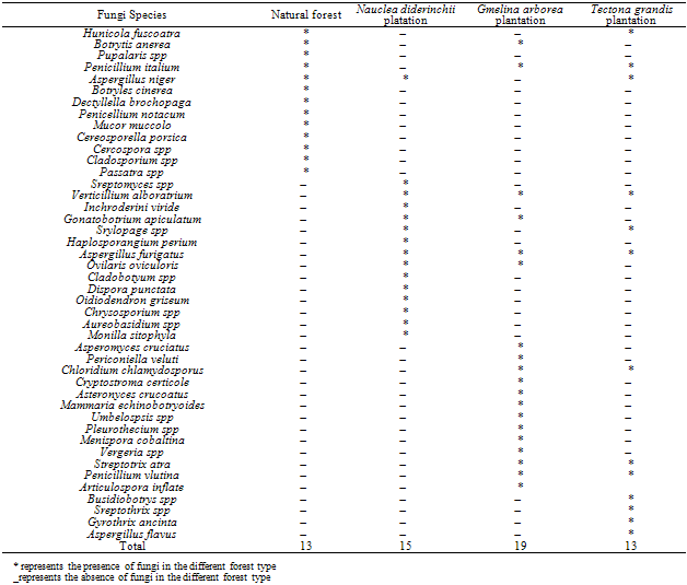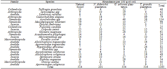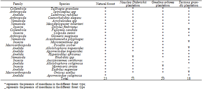 The abundance and species diversity of mesofauna and litter arthropods were surveyed in the natural forest and three plantations (Nauclea diderichii, Gmelina arborea and Tectona grandis plantations) in Akure Forest Reserve, Aponmu Nigeria to examine the effect of plantation development on both the abundance and species diversity of litter arthropods and mesofauna. The effect of microorganism’s abundance and species diversity on their abundance and species diversity was also assessed. Sample Plot of 100 m × 100 m blocks were laid in each habitat. Soil samples were taken from the selected sample plots to isolate and identify mesofauna and microorganisms while litter arthropods caught were preserved and identified. During the survey, 1165 individuals of mesofauna were encountered (distributed in 23 species) in all the studied habitats. Mesofauna abundance was highest in Gmelina arborea plantation (334 individuals) while Nauclea diderichii plantation has the least abundance of 201 individuals. Highest species diversity was recorded in Natural forest with 23 species while the least species diversity was found in the Tectona grandis plantation. 64 individual of litter arthropods were however encountered in the study area (distributed in 27 species). Natural forest accounts for the highest in both the species diversity and abundance (i.e. 21 individuals and 11 species respectively.) Tectona grandis accounts for the least species diversity in the studied habitats (5 species) and Gmelina arborea plantation has the least abundance of litter arthropods (12 individuals).