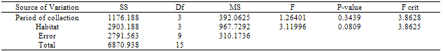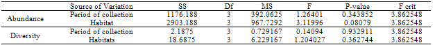 Table 6. ANOVA table showing the effect of the habitats and period of collection on Abundance the species diversity of mesofauna  |