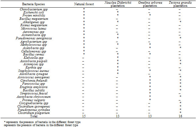 The result of the effect of plantation development on the mesofauna abundance is presented in Table 1. 1165 individuals were encountered in all in the study area. The Gmelina arborea plantation account for the highest abundance of mesofauna (334 individuals in all) followed by Tectona grandis plantation (316 individuals), natural forest (314 individuals) while Nauclea diderichii plantation has the least abundance of 201 individuals for the four trips to the studied habitats.The result also show that Acrobeloidea spp was found to have the highest number of individuals (114 individuals) and it cutting across all the studied habitats, while Aporrectodae caliginosa was seen to have the least number of individuals (11) occurring in only two habitats (i.e. Natural forest and Tectona grandis plantation) throughout the whole duration of the period of study.The result of the effect of plantation development on the mesofauna species diversity is presented in Table 2. 23 species were encountered in the four studied habitats, the natural forest recorded the highest species diversity of 23 species followed by Nauclea diderichii plantation (21 species), Gmelina arborea plantation (20 species) while the least species diversity was found in the Tectona grandis plantation.Most of the species encountered in the study area were common to all the habitats e.g. Tullbagia granilata, Spirosteptus spp, Caenorhabditis elegans, Mesodiplogaster inheriteri etc. Aporrectodae caliginosa was found in only two habitats (i.e. natural forest and Tectona grandis plantation), while species like Dorylus fimbriatus, Acanthamoeba pilyphages, e.t.c where found in three habitats each in the study area. However none of the species appears in a single habitat in the study area.Table 3 shows that 207 individuals of litter arthropods were encountered per hectare of the study area, the natural forest accounts for the highest frequency of individuals (67) individuals, followed by Tectona grandis plantation (52) then Nauclea diderichii plantation (49) while Gmelina arborea plantation have the least (39 individuals/hec).The result of the effect of plantation development on the litter arthropods species diversity is presented in Table 4. 27 species of litter arthropods were encountered in the studied habitat. Natural forest also accounts for the highest species diversity of litter arthropods (11 species) followed by Nauclea diderichii plantation (8 species) while Gmelina arborea plantation recorded 7 species Tectona grandis plantation recorded the least (5 species).Ants also recorded the highest species diversity. Ants is present in all the habitats of the studied area Cassutia flaveole and spider were also found to be common to three habitats of the studied habitats, while Sinoxylon senegalensis and millipedes were found in two habitats of the studied habitat. Species like Capius spp and Chrysolagria colgi are found in only one habitats of the studied area.ANOVA, table 5 shows that the effect of plantation development is not significant (P≥0.05) on the abundance of the mesofauna. Also the block effect, show that the effect of the different period of mesofauna collection or sampling was not significant (P≥0.05) on the abundance of the mesofauna. ANOVA table 6 shows that the effect of plantation development is not significant on abundance and the species diversity of the mesofauna, likewise the period of collection or sampling of mesofauna is not significant.The result of the effect of plantation development on the bacteria’s species diversity is presented in Table 7; thirty three (33) species of bacteria were encountered in during the study. The highest species diversity was recorded in Tectona grandis plantation with 16 bacteria species, followed by natural forest with 15 species, 13 species were observed in Nauclea diderichii and Gmelina arborea plantation respectively.The species that are commonly found in at least three habitats were: Proten mirobilis, Alkaligenes spp, Pseudomonas aeniginosa, Methylococcus spp, Acetobacta spp, Bacillus cereus and Staphylococus aureus, while those found in one habitat only were: Chrrobacterium spp, Bacillus megaterium, Roteus megaterium, Micrococus luteus, Aeromonas spp, Agrobacterium spp, Cellulomonas spp, Klebsiolla spp, Proteus vulgaris, Corygnebacteriu spp, Clostridium sporegenes, Pseudomonus syrindea and Clostridium plagarium. Most of which are found in the natural forest. The rest (e.g. Eruginia amyloiora, Bacillus subtilis) where found in at least two of habitat of the study area. However none of the bacterial species appeared in all the four habitats together.The result of the effect of plantation development on fungi species diversity is presented in Table 8. Forty four (44) species of fungi where encountered in the studied habitat, during the study. The highest fungus species diversity was encountered in Gmelina arborea plantation with 19 different species followed by Nauclea diderichii plantation (15 species) while fungi diversity were least in Natural forest and Tectona grandis plantation (each with 13 species)The species that were most commonly found in at least three habitats were: Penicillium italium, Aspergillus niger, Aspergillus furigatus and Verticillium alboratrium most of the fungi species appeared in only one of the habitats e.g. Sreptothrix spp, Gyrothrix ancinta, Aspergillus flavus, e.t.c while others appeared in at least two habitats of the study area e.g. Ovilaris oviculoris, Chloridium chlamydosporus, Streptotrix atra. However none of the fungal species appeared in all the four habitats together.ANOVA table 9 show that the effect of plantation development on abundance of bacteria and fungi species was not significant (P ≥0.05).Table 10 shows that relationship between the abundance of mesofauna and litter arthropods is not significant (P > 0.05). The rate at which the change in the abundance of mesofauna affects the abundance of litter arthropods in the habitats is v