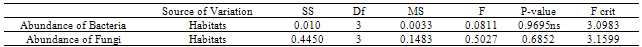 Table 9. ANOVA table for the effect of the habitat types on the abundance of bacteria and fungi in the study habitat  |