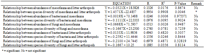 The plantation development has little effect on the abundance and species diversity of mesofauna. Plantation development does not significantly affect the abundance and species diversity of litter arthropod. The changes in abundance of mesofauna in forest habitats does not significantly affect the change in abundance of litter arthropods in the different forest habitat however the change in species diversity of mesofauna in a forest habitat have a positive strong influence on the species diversity of litter arthropods that will be present in the different habitats.The change in abundance and species diversity of both fungi and bacteria species in the study habitats does not have a significant affects on the abundance and species diversity of mesofauna. The changes in abundance of both bacteria and fungi in between habitats will cause a fairly strong change in the abundance of litter arthropod in the different habitat, while change in species diversity of both bacteria and fungi do not have noticeable effect on the change in species diversity of litter arthropod.
