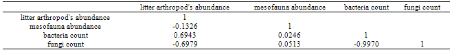 Table 11. Correlation between abundance of litter arthropods, mesofauna, bacteria, and fungi in the studied habitats  |