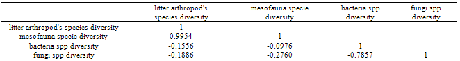 Table 12. Correlation between species diversity of litter arthropods, mesofauna, bacteria, and fungi in the studied habitats  |