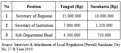 Incentive system is the overall revenue received by employees, in addition to regular salaries of civil servants or honorarium for non-civil servants. It includes civil servants additional income, events honorarium and incentive fees. After document review and interviews about the editional income (incentive), specific to Civil Servants’ Additional Income is set in the Regulations Mayor of Tangsel No. 4 Year 2012 about the Granting of additional income. Additional Income of Civil Servants in South Tangerang City was considered as higher than Surakarta, Central Java as seen in the table below: Table 1. Example Comparing Additional Income |