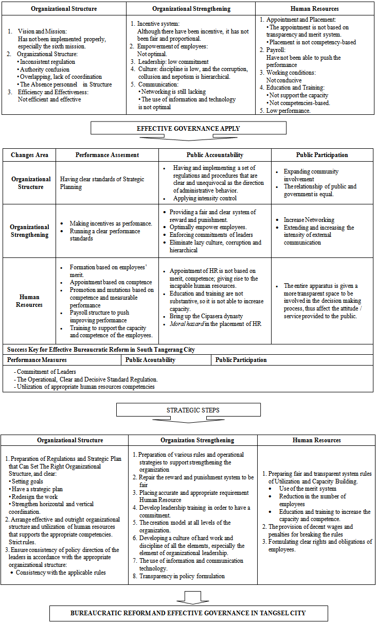 Bureaucracy is regarded as a large-scale organization and has a broad scope for responding the complexity of administrative tasks [1]. However, bureaucracy is considered as obstacles, due to the hierarchical, inefficient, inflexible, ineffective and not autonomous system. Such bureaucratic obstacles will grow continuously if allowed in the community and will reduce the level of trust towards the service and performance of the bureaucracy.In addition, local governments should become the spearhead of community service, but in real practice, there are many regional heads are entangled with corruption. However, today's society is increasingly open, requires a change of mindset and culture set from local government bureau- cracy. Therefore, in 2010 Government issued Regulation No. 81 Year 2010 on the Grand Design of Bureaucratic Reform as a guide for ministries, agencies and local governments to implement reforms to support effective governance. There are three objectives in the Grand Design of Bureaucratic Reform, i.e. the first target (2010-2014); the second target (2015-2020); and the third target (2021-2025); as well as the nine areas of change. Near the end of 2014, each local government should have implemented the bureaucracy reform, including the South Tangerang (Tangsel) City Government. However, the preliminary results showed that South Tangerang City Government apparently did not implement the bureaucratic reform. Organization structure in South Tangerang City has not shown identified rightsizing, as allegedly happen in excess structure that does not follow the provisions of Regulation No. 41 Year 2007 about Regional Organization Unit. In the area of the organizational strengthening, employee empowerment is not optimal because there is a number of employees who were recruited exceeding the demand. Moral hazard was seen very thick on the removal or placement or rotation of human resources in South Tangerang City.In the context of bureaucratic reform, restructuring is necessary to refresh or revamp the organization structure and the function is not redundant to avoid ineficiency [2]. In addition to the appropriate structure of organization, it makes the organization effective and the government's performance in the public sector [3]. Local Government bureaucracy as an organization and sub-system cannot be separated from the influence of other environmental sub-systems [4]. Therefore, the Organizational strengthening is required to improve the adaptability to the environmental development. Similarly, the issue of human resources should receive greater concern in the development and management, as employees plays an important role within an organization [5]. Looking at the complexity of the problems in the above-mentioned areas of change, South Tangerang City Government should have carried out the reform of the bureaucracy. But in reality, Tangsel City Government has not implemented the bureaucratic reform yet. Although, reform has been measured, but it is insignificant, thus the effective governance has not been achieved [6]. According to Callahan, so far the government has failed in realizing their performance; therefore effective governance should have measurable performance, accountability and public participation. To see how the implementation of bureaucratic reform in South Tangerang City, this research tries to describe and analyse: The implementation of bureaucratic reform in the areas of the organization structure, organizational strengthening and human resources in South Tangerang City; the implementation of an effective bureaucratic reform, which led to the establishment of effective governance; and the model recommendation of an effective bureaucratic reform in Tangsel City.