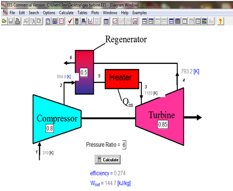 The basic components of a gas turbine shown in Figure 1 below are compressor, a combustion chamber (air heater), a turbine, and a regenerator. The compressor model has ambient air as an inlet; the mass flow rate at the compressor inlet was selected to be equal to the manufacturer given value of 118 kg/s for the gas turbine inlet and was kept constant. The outlet, which goes to the combustion chamber, is determined by assuming zero pressure drops at the compressor inlet, a compressor ratio of 10.5, and an isentropic efficiency of 83%[3].The combustion chamber has two inlets, the compressor outlet and the fuel, the fuel was assumed to be pure methane at 15°C and 1300 kPa. At full load its mass flow rate is set to match the manufacturer-specified firing temperature. Once the full load fuel rate is set in this case 6230 kg/hr, part loading is simulated by adjusting the fuel mass flow rate. The chamber is assumed to have zero pressure drops. The reactor products exit the combustion chamber and enter the turbine. The turbine’s isentropic efficiency is assumed to be 85%, the pressure ratio is taken to be 10.5 and the pressure drop at the gas turbine exit is assumed to be zero. The turbine exhaust is synonymous with the exhaust of the gas turbine.The gas turbine exhaust goes to a heat exchanger block, which simulates the removal of waste heat. Zero pressure drops was assumed, and the exit temperature of the block was selected to be 200°C. This is because condensation issues might arise at temperatures lower than 200°C, thus, 200°C is a conservative approximation[4, 5]. | Figure 1. Regenerative Gas Turbine (RGT) Modeling and Integration using EES |