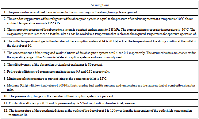 A single-effect ammonia (NH3)-water absorption cycle shown in Figure 3 is developed in this study and coupled with the gas turbine to cool the ail inlet to the compressor of gas turbine. The state points and assumptions of the cycle operation are summarized in Table 2.Table 2. State points and assumptions  |