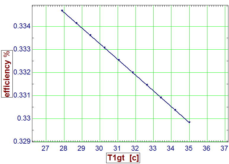 The inlet air cooling improves both the efficiency and the work net of the gas turbine cycle as shown in the Figures (5) and (6) below. As a result of decreasing inlet air temperature, the work net of the power plant improved by 5.9 percent and the efficiency of the power plant improved by about 0.49 percent.