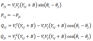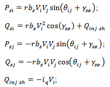 is rated voltage of the transmission line, where the UPFC is connected. It is connected to the system through two coupling transformers integrated into the model of the transmission line.The whole UPFC model for representing power flow is depicted in Figure 1 or equation (6).![]() | Figure 1. Complete injection model of UPFC |