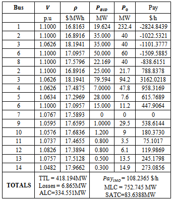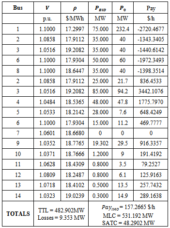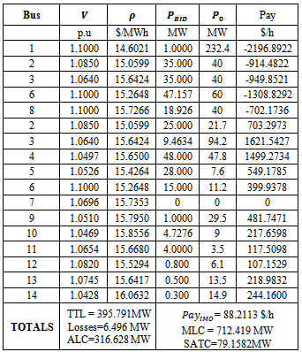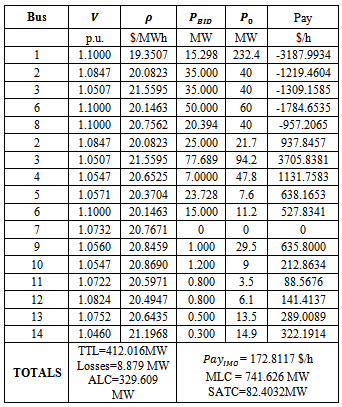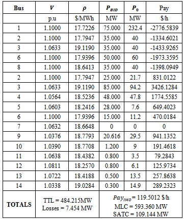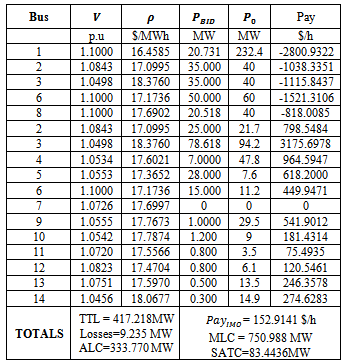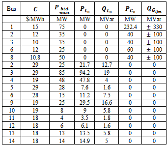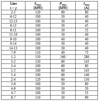 . Maximum active power flow limits were computed off-line using a continuation power flow with generation and load directions based on the corresponding power bids, whereas thermal limits were assumed to be twice the values of the line currents at base load conditions for a variation kV voltage rating. In Table 2, it is assumed that