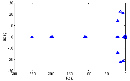 ![]() | Figure 2. Eigenvalue the IEEE 14-bus system with UPFC on line-11. Statistics of Eigenvalue: Positive eigs: 0; Negative eigs: 27; Complex pairs: 6; Zero eigs: 0; Dynamic order: 27 |
