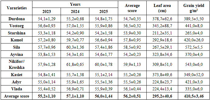 Chlorophyll content is one of the complex genetic traits and its manifestation depends on endogenous and exogenous factors. Among the important factors for the high content of chlorophyll in plants are nitrogen-fertiliser [7] applications. Impairment of synthesis of photosynthetic pigments is caused by a number of biotic [5,6] and abiotic [3] factors. In addition to chlorophyll, plants also contain carotenoids, pigment groups that give yellow, orange and red colours, assist in light absorption and protect plants from excessive light. The aim of measuring chlorophyll is not only to determine its quantity, but also to obtain broad information on the general physiological state of the plant and its plasticity under stress conditions.This analysis serves several important aspects. Chlorophyll is the main pigment in the photosynthesis process [8]. Higher chlorophyll content indicates higher photosynthetic potential and thus higher efficiency of converting solar energy into organic matter, which in turn leads directly to higher biomass accumulation and yield. Chlorophyll content serves as a rapid indicator of plant status.Under stress factors such as drought, high temperature, salinity, nutrient deficiency or disease, the chlorophyll content can decrease. Therefore, by measuring chlorophyll the plant’s ability to resist stress can be assessed. Breeders widely use chlorophyll-content measurement to evaluate varieties photosynthetic potential at early stages, enabling selection of those with high yield potential [4].Analysis of the results showed that when chlorophyll content was analysed the differences among varieties were clearly manifested. According to the results, in 2023 the varieties overall mean was 55,2±1,10; the varieties Vostorg (56,6±0,93), Kamol (57,2±0,80), Sila (57,7±0,96) and Nikifor//Kroshka (57,9±1,28) showed higher values than the mean. (Then you list the table etc.).Table 1. Chlorophyll content of varieties (SPAD-500)  |