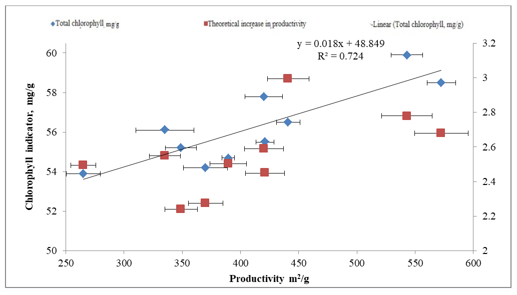 In 2024 the overall mean chlorophyll content rose to 57,1±1,10 due to the relatively cooler and more humid weather (average temperature 19,83°C, annual rainfall 98 mm, with heavy rainfall (50 mm) in March). Such favourable conditions created an optimal environment for photosynthesis, leading to an increase in chlorophyll content. As a result, Nikifor//Kroshka (61,8±0,65) and Sila (60,3±1,36) varieties recorded the highest results, followed by Kamol (59,7±0,77), Vostorg (57,0±1,55) and Vlada (56,9±0,71). The lowest results were in Starshina (54,2±0,90) and Ayvina (54,3±1,61) varieties.In 2025 the overall mean chlorophyll content was 56,0±1,44, lower than in 2024. The decrease is explained by early temperature stress (up to 35°C) during the heading and flowering periods in April-May, despite the average temperature (19,67°C) and rainfall (147 mm) being relatively favourable. Nevertheless, varieties Nikifor//Kroshka (60,6±1,78) and Sila (57,4±1,86) retained high values; Kamol (56,6±0,94) and Vostorg (55,9±0,86) also yielded above-average. The lowest three-year means were observed in Starshina (54,2±1,58) and Ayvina (54,6±1,77).According to the three-year average results, the total average chlorophyll content of the varieties was (56,2±0,51). The varieties Nikifor//Kroshka (59,9±1,13) and Sila (58,5±0,92) showed results above the general average. The varieties Kamol (57,8±0,95), Vostorg (56,5±0,32) and Vlada (56,1±0,44) also showed results above the average. The lowest three-year average values were found in the varieties Starshina (53,9±0,30) and Ayvina (54,2±0,23).The analysis shows that although chlorophyll content varied among years, varieties such as Nikifor//Kroshka and Sila exhibited superiority in this trait. Higher chlorophyll content helps the plant to carry out photosynthesis more efficiently, which positively affects overall growth and yield potential. | Figure 1. The effect of total chlorophyll on productivity |