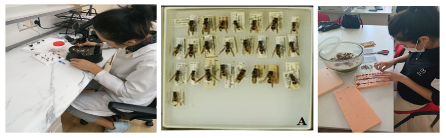 To determine the distribution of true bees under natural and anthropogenic conditions, biomaterials were collected from various landscapes and agrocenoses of the Tashkent oasis.For softening the bodies of the collected specimens, the method of Jurzitza (1975) was used. [12] For this purpose, the captured insects were placed into a wide-mouthed container, and a piece of ordinary cotton soaked in 70% ethyl alcohol was placed on top. After 10–15 minutes, the bees became softened, allowing them to be properly positioned, fixed, and prepared as collection specimens. The prepared samples were then organized and catalogued. (Figure 2).  | Figure 2. Identification of species using laboratory methods |