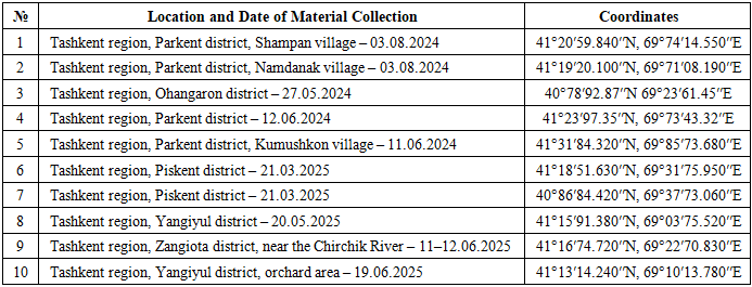 During the collection of materials, the locations were recorded using GPS coordinates, and the obtained data were entered into a database.When forming the database, the collection site and date, as well as the geographical coordinates of the area, were used as the main criteria. The list of the studied biotopes was numbered and presented accordingly (Table 1).Table 1. Coordinate point of the area where the research was conducted  |