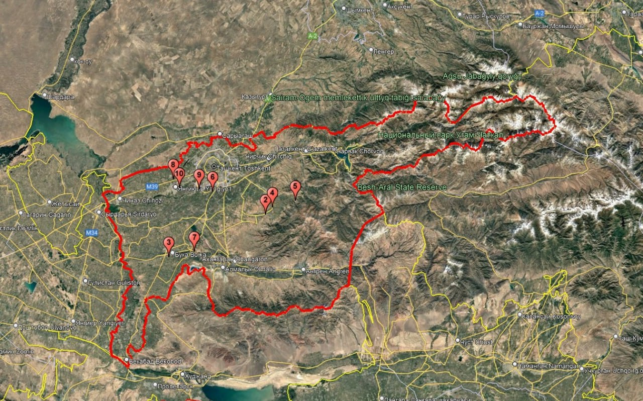 Based on the database formed during the research process, GIS maps were created to illustrate the distribution areas of Vespidae species in the Tashkent oasis (Figure 3). | Figure 3. Map of the area where the research was conducted |