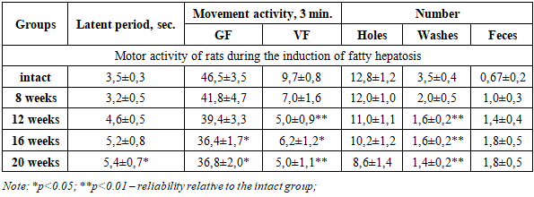 Nonalcoholic fatty liver disease (NAFLD) is currently the most common type of liver disease, accounting for 70% of all liver diseases [1]. NAFLD affects approximately one-quarter of the world’s population, and is projected to reach 33.5% by 2030 [2].Recent studies have identified NAFLD as a disease that affects not only the liver but also the central nervous system, and is associated with cognitive impairment and dementia. Scientific sources suggest that dyslipidemia may be a causative or contributing factor in the development of Alzheimer’s disease. Neurological changes such as cognitive decline and memory impairment may be closely linked to NAFLD-associated conditions such as insulin resistance, hyperammonemia, vascular dysfunction, gut microbiota imbalance, and inflammation [3].NAFLD usually develops against the background of obesity. According to data, excess body weight, especially in adulthood and middle age, increases the risk of cognitive impairment and Alzheimer's disease by up to six times. Also, obesity that occurs in middle age significantly increases the risk of dementia and Alzheimer's disease compared to obesity in later life [4,5].The aim of the study was to study behavioral indicators in dynamics in a fatty liver model. To assess behavioral changes, the "Open Field Test" was conducted.The advantage of this test is its simplicity and convenience, when animals are placed in an unfamiliar open field, changes in behavior and behavior, the number and quality of movements in them are studied. In our studies, experimental rats were transferred to the central square in the "open field", and their latency period, i.e. the time to exit the square, the number of squares entered by the rats - horizontal activity (GF), the number of times the rats stood upright on their hind legs - vertical activity (VF), the number of "holes" in the square where the animal sniffed and stuck its head - exploratory activity (OF), washing movements, as well as the number of feces they secreted were counted. Self-washing of rats usually occurs when they are stressed, in which case their excretion of feces also increases, and therefore their number was recorded. According to these values, the motor activity, convulsive and vegetative reactions of the animals are evaluated. The special importance of this method is that it is convenient to describe the specific course of neurophysiological mechanisms in the study and recording of behavior. This method is effectively used in the study of the activity of the higher nervous system.