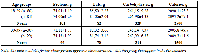 The observations were carried out in the year 2023 in the selected group of lactating women aged 18-29 years and aged 30-39 years from the Kasbi and Chiroqchi districts of the Kashkadarya region. The first step in observing the study group was the voluntary selection of respondents according to the Helsinki declaration. In the next step, educational work and discussions about rational nutrition took place in the group of lactating women. The respondents' current consumption of food products was examined through the classical questionnaire survey method [6]. The respondents recorded their consumption of various food products over seven days in the specially designed questionnaire sheets. Checking of the questionnaires took place each day. The collected information was analyzed through the proper methodological approach. The protein, fat, and carbohydrates' content in the food products was calculated through the specially designed table [5]. The mathematical calculation and statistical treatment of the questionnaire information were carried out through the Microsoft Windows Excel software package. The results were compared with the proper norms [4].