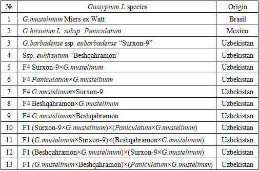 Experimental site, period, and agronomic managementField experiments were conducted during 2021–2024 at the regional experimental field of the Institute of Genetics and Plant Experimental Biology, Academy of Sciences of Uzbekistan, located in Zangiota district, Tashkent region. The experimental site is situated approximately 0.5 km northeast of Tashkent city at 41°20′ N latitude, 69°18′ E longitude, along the upper terrace of the Chirchiq River, at an altitude of 398 m above sea level.The soil of the experimental field is classified as typical light gray soil, characterized by low humus content and a medium loamy texture. The terrain is slightly sloped, non-saline, with weak natural infestation by Verticillium wilt, and with deep groundwater levels (7–8 m). The climate of the region is sharply continental, featuring hot summers (June–August), cold winters (especially December–January), 175–185 sunny days, and a frost-free period of 200–210 days. Precipitation mainly occurs in autumn, winter, and spring, whereas summers are dry, necessitating supplementary irrigation for cotton cultivation.All agronomic practices were carried out according to the standard management protocols adopted at the Institute’s experimental farm. In autumn, fields were cleared of cotton residues and deep-plowed to a depth of 35 cm. In early spring, harrowing was performed to conserve soil moisture and suppress early weed emergence. Sowing was conducted in the third decade of April using a 90 × 20 × 1 cm planting scheme, with seeds placed at a depth of 4–5 cm. Inter-row cultivation, weed control, and irrigation were applied in an integrated manner throughout the growing season. Pest control included the application of GXSG against cotton bollworm and BI-58 against aphids at a rate of 2.0–2.5 kg per ton of water.Table 1. List of Gossypium L. species and derived F1–F4 hybrids included in the experiment (Origin)  |