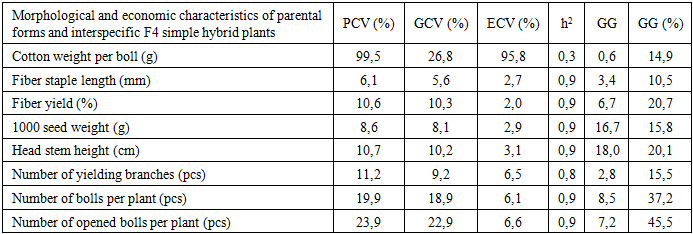 Cite this paper: A. A. Iskandarov, M. K. Kudratova, O. A. Mukhammadiev, F. U. Rafieva, F. N. Kushanov, Heritability, Genetic Advance, and Correlation of Agro-Morphological Traits in Interspecific Simple and Complex Cotton Hybrids, International Journal of Genetic Engineering, Vol. 14 No. 1, 2026, pp. 1-6. doi: 10.5923/j.ijge.20261401.01.