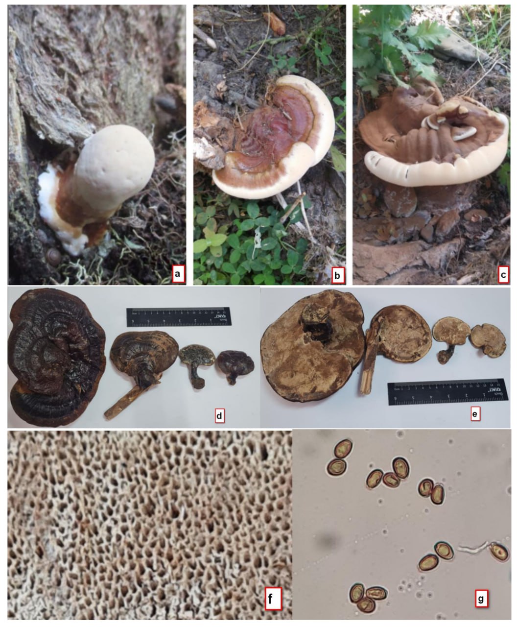 G. resinaceum is characterized by annual, stipitate basidiomata with a distinctly varnished, glossy, reddish-brown pileus surface. The basidiocarps are relatively thick, measuring 8.0–22.0 × 6.0–10.5 × 2.0–3.0 cm. The pileus margin is slightly incurved (concave), and the surface is smooth to slightly wrinkled. The margin is rounded, light greyish-yellow (ochre-buff), and approximately 1.0–1.5 cm wide. The stipe is short, laterally attached, reddish-brown in color, and measures 5–6 × 2–3 cm. The hymenial surface varies from cream to brown and contains circular to irregular pores, with a density of 2–6 pores per mm and pore diameters ranging from 97 to 306 µm. Basidiospores are yellowish-brown to fuscous, broadly ellipsoid to ovoid, semirugose, and possess a thick wall. Spore dimensions range from 9–13 × 5–8 µm (Figure 1).  | Figure 1. Morphological and microscopic characteristics of Ganoderma resinaceum: a – young basidiocarp at the initial developmental stage, b – pileus surface showing a laccate, reddish-brown crust, c – Lateral view of a mature basidiocarp attached to the host tree, d–e – Dried basidiocarps (herbarium specimens), f – hymenial surface, g – ellipsoid, double-walled basidiospores observed under light microscopy |