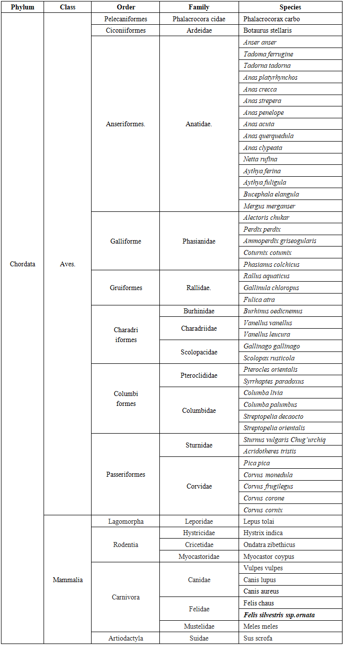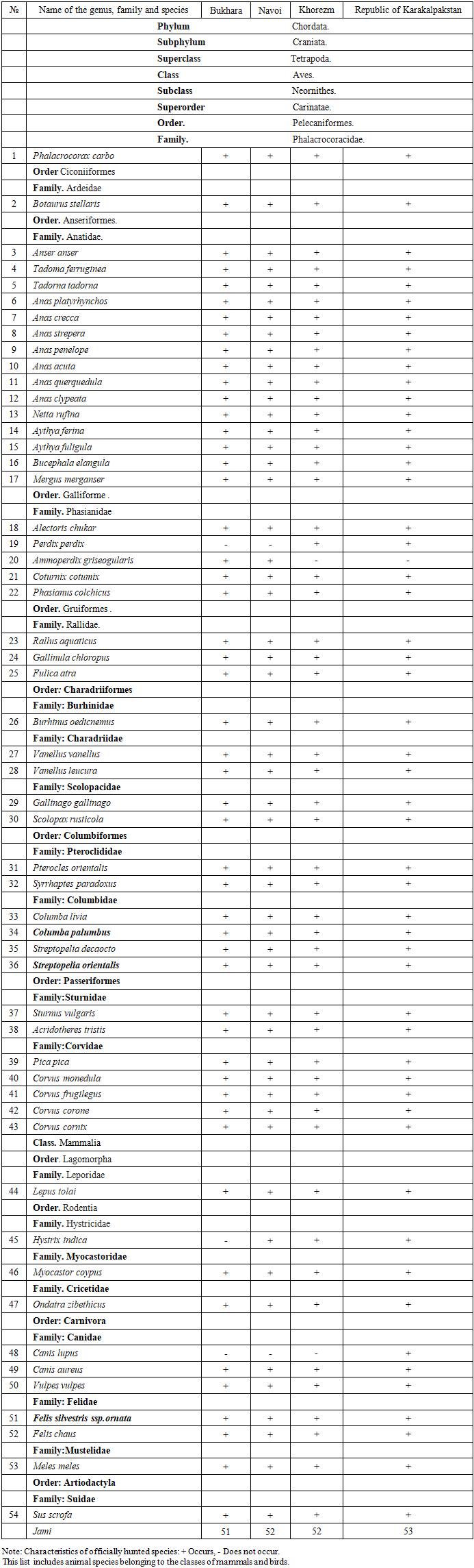 Climate change, uncontrolled livestock grazing, recreational activities, and large-scale construction are leading to the degradation of natural ecosystems and a reduction in biodiversity in the lowlands of Uzbekistan. Rational use and protection of wild animals and animal products are of national and international importance. A systematic analysis of animals harvested in the lowlands of the desert zone of Uzbekistan revealed the presence of 2 classes, 12 orders, 20 families, and 54 species of animals and birds (Table 1) [6,9,13].Table 1. Distribution of animal species permitted for hunting in the lowlands of the desert zone of Uzbekistan in the study areas  |