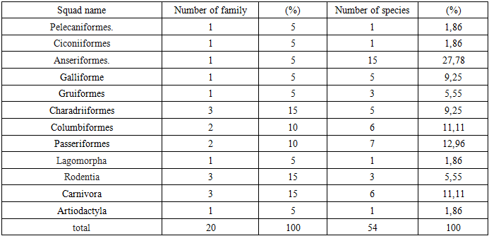 The order Anseriformes is the most abundant in species composition in the desert lowlands of Uzbekistan, comprising 15 species (27.78%), which is more than in other orders. This is also explained by the widespread distribution of Anseriformes in nature (Table 2).Table 3. Taxonomic composition of animals harvested in the lowlands of the desert zone of Uzbekistan  |