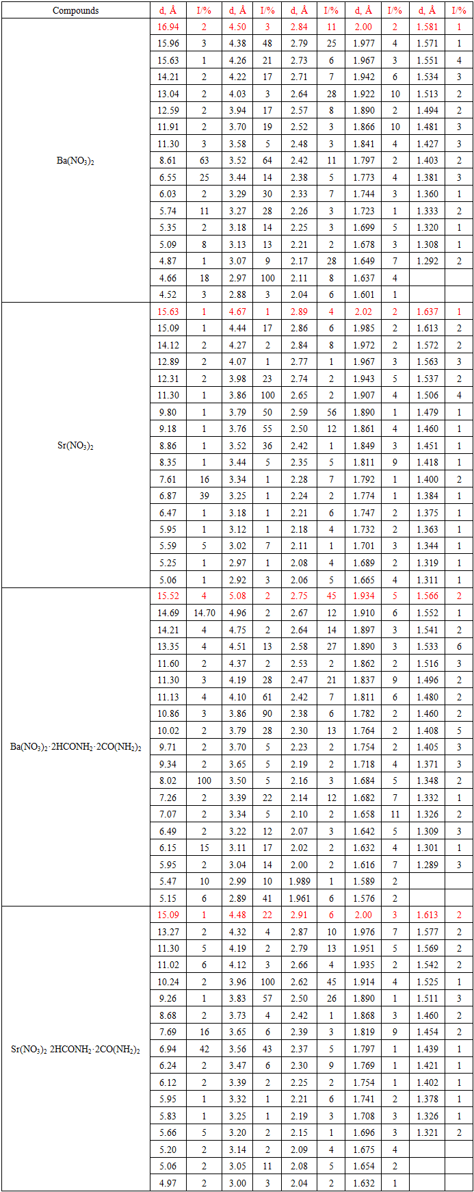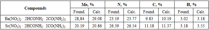 Comparison of the interplanar distances and relative intensities of barium and strontium nitrate, formamide, carbamide and coordination compounds of the compositions [Ba(NO3)2·2HCONH2·2CO(NH2)2], [Sr(NO3)2·2HCONH2·2CO(NH2)2] showed that the new coordination compounds differ significantly from each other and from similar initial compounds. Consequently, the synthesized barium and strontium nitrate complexes have individual crystal lattices (Table 1).Table 1. Results of elemental analysis of mixed amide coordination compounds of barium and strontium nitrates with formamide and carbamide  |