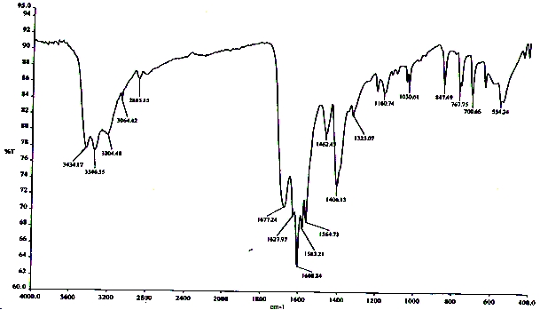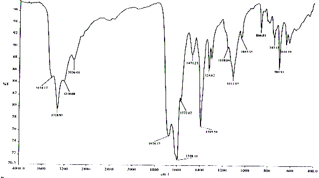 In the IR absorption spectrum of the free formamide molecule, two frequencies are observed at 1692, 1316 cm-1, corresponding mainly to the valence vibrations of the C=O and C-N bonds. The IR absorption spectrum of the uncoordinated carbamide molecule is characterized by several frequencies. Of these, at 1680 and 1466 cm-1, bands corresponding to the valence vibrations of the C=O and C-N bonds are observed. With the transition to a coordinated state, i.e., in mixed amide coordination compounds, the C=O frequency decreases by 8-23 cm-1. While the C-N frequency value increases by 6-10 cm-1, indicating the coordination of amides through the oxygen atom of the carbonyl group. The 3200-3400 cm-1 bands confirm the presence of crystallization water in the molecule. (Fig. 1,2). | Figure 1. IR absorption spectrum of the mixed amide complex compound of barium nitrate with formamide and carbamide - Ba(NO3)2·2HCONH2·2CO(NH2)2 |