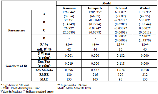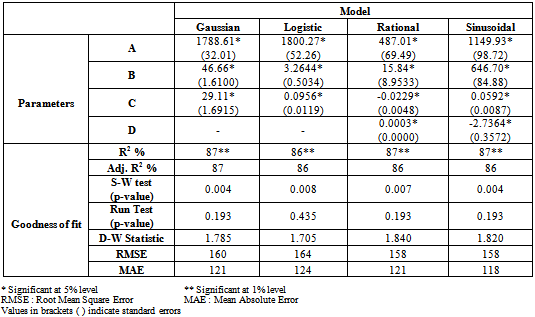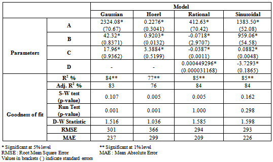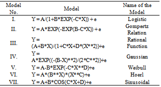 is a non-linear regression model as the derivatives of Yx with respect a and b are both functions of a and /or b. Details about the family of non-linear models are mentioned in Bard[2], Seber and Wild[26], Ratkowsky[24], Draper and Smith[5] and Montgomery et al.,[17]. Like in linear regression, parameters in a non-linear model can also be estimated by the method of least squares. However, due to the difficulty in the procedure of computation, the common practice is to work with the log transformed model.The log transformation is valid only when error term ‘e’ in the above equation is multiplicative in nature. Thereafter, method of least square is used to estimate the unknown parameters. Furthermore, R2 value is calculated to measure the goodness of fit of the model.The log transformed procedure suffers from some important drawbacks.a). Original structure of the error term got disturbed due to transformation.b). R2 values computed, assess the goodness of fit of the transformed model and not of the original non-linear model.c). Proceeding further to carryout residual analysis for the residuals generated by the transformed model, will result in erroneous conclusion.As a remedy to these pitfalls, non-linear regression procedures are already developed in literature which necessitates computer intensive tools to find solution for the parameters (Venugopalan and Shamasundaran[30]). The following non-linear models are considered in the present investigation.