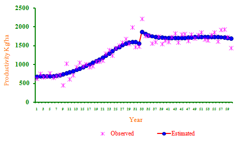 where Y is the area/production/productivity during the time X; A, B ,C and D are the parameters, and e is the error term. The parameter ‘C’ is the intrinsic growth rate and the parameter ‘A’ represents the carrying capacity for each model. Symbol B represents different functions of the initial value Y(0) and d is the added parameter. In addition to the above non-linear models some other non-linear models also are employed as per the data need.Four main methods are available in literature (Seber and Wild[26]) to obtain estimates of the unknown parameters of a non-linear regression model. These are: (i) Gauss-Newton method (ii) Steepest-Descent method (iii)Levenberg-Marquardt technique and (iv) Do not use derivative (DUD) method. However, in all these methods the following steps are carried out.Step (i). Starting with a good initial guess of the unknown parameters, a sequence of θ’s which hopefully converge to θ is computed.Step (ii). Error sum of squares or objective function expressed as