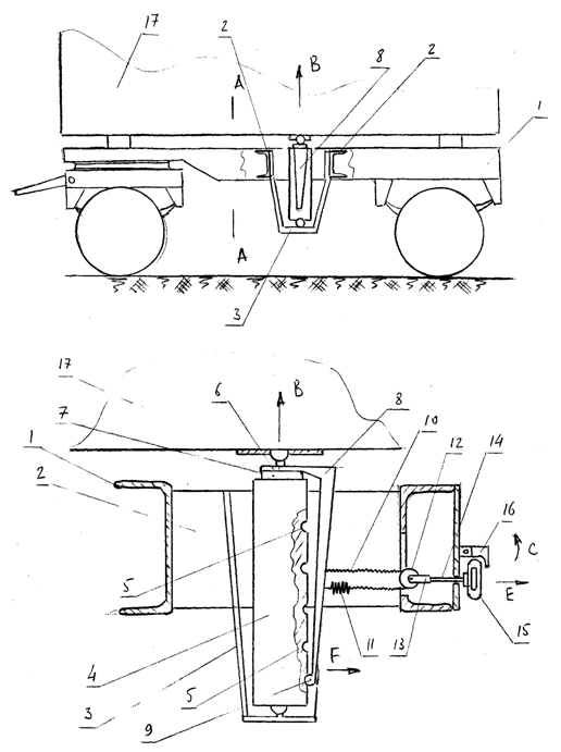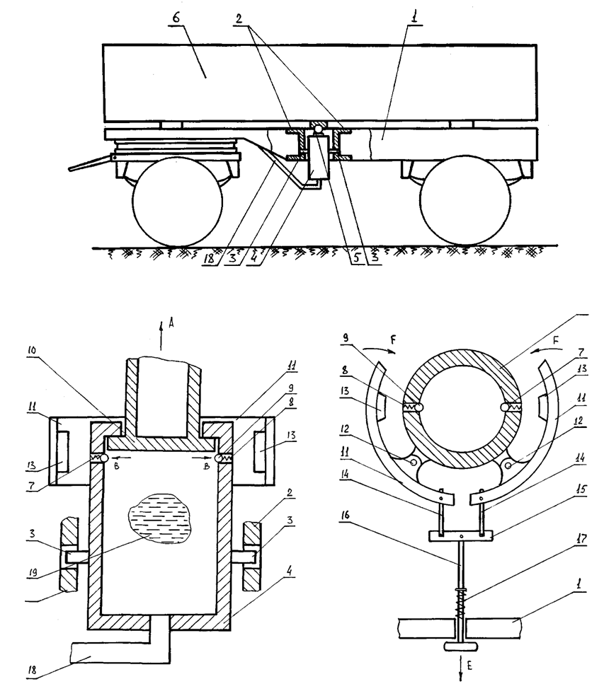 The outer tube 4 is covered by the hydraulic ram 11 of the bell crank 12 by hinges mounted on the outer tube 4. One ends of two-armed levers 11 are provided with permanent magnets 13 and others, by means of rods 14, pivotally attached to crossmember 15 is rigidly fixed to the rod 16, mounted movably on the chassis 1 and a spring-loaded by a compression spring 17 with respect to the latter. The outer pipe 4 is connected to the hydraulic ram of the tractor hydraulic system (for it is not shown in the drawings) by a conduit 18, feed the hydraulic fluid 19 in the hydraulic ram. Powered Two-axle dump trailer follows. To unload cargo from the tipper platform 6, commonly known in the art, is fed under pressure from the hydraulic fluid 19 in the conduit 18, and under the action of a small pipe 5 extends from the outer tube 4 at the arrow A, and reaches a position as shown in Fig. 5. Before it reaches the position of the bottom 10 with their end surfaces interact with the ball shaped latches 9 retractable blocked by arrows B in the channels 7 formed in the outer tube 4, and when the bottom 10 to be held by the latter, under the action of compression springs 8 ball shaped latches 9 are returned to the initial position such as is also shown in fig.5. In case of leakage of the working fluid 19 or other emergency situations under the effect of its own weight of the platform 6 small tube 5 can not move downward in the direction opposite arrow A, since the ball shaped latches 9 securely fixed in its said upper position. In this position, the hydraulic ram service personnel without fear of Self-start platform 6, producing underneath repair or maintenance work. For lowering the platform 6 in the transport position to drawn 16 by the arrow E (Fig. 5) corresponding to the applied force and she moving in this direction, helps turn double-arm levers 11 of the arrows F, and once they have their permanent magnets 13 to touch the surface of the outer tube 4 by the magnetic force of attraction ball shaped clamps 9 move the arrows B, thus providing easy access to the bottom 10 of the small tube 5 between them. Thereafter, the force acting on the arrow E is removed, and under the action of compression spring 17, rod 16 returns to its original position, turning of the bell crank 11 in a direction opposite to arrows F. Further described processes may be repeated several times.Analyzing the structure of the above devices and his work can be seen that the most important parameter is the initial pair of radial forces applied Pr permanent magnets located on the bell crank operated by a thrust manually. The numerical value of each of these forces can be determined according to known: