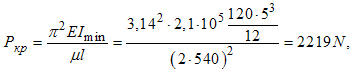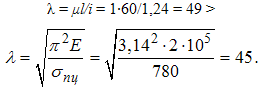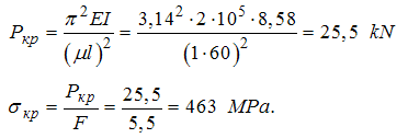 As 49 > 45, as to determine the critical force Ркр Euler's formula is acceptable, which can be calculated by following the provided dependency, and to determine the numerical value of the critical stress :