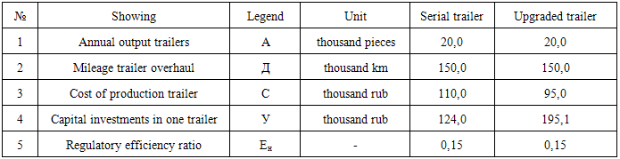 If we consider that between the permanent magnet and ball retainer is a compression spring, then we will force its total deformation equal 25kgf and, using reference data [13] choose its rigidity equal с = 2,76 kgf/mm, such that the geometrical characteristics of the spring as follows: the total number of revolutions n = 5, the outer diameter of the spring DH = 24 mm, step loop t = 6 mm, spring material – wire Н by GOST 5047-79.For the economic evaluation, with the possible introduction of the proposed technical solutions used technique financial investment analysis and audit in the implementation of new technology [17]. As a basic sample accept serial Tractor tipper trailer model 2PTS-4-793A, which is mounted on the chassis frame hydrolift made on these RU2463179, RU2481971. According to existing regulations placed on the trailer overhaul after its run in 150 000 km and at this time it will be possible to retrofit. Calculation of economic efficiency of implementation of the proposed technical solutions, such as follows. For this we use the following parameters (see Table 1).Тable 1. Input  |
