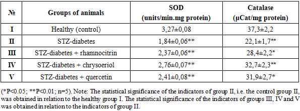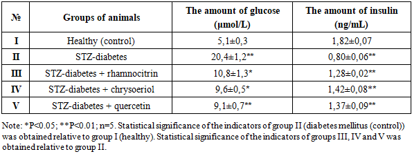 The experiments were conducted on male outbred albino rats weighing 180-200 g. Scientific research on experimental animals was carried out in accordance with the International Helsinki Declaration, the rules developed by the Council for International Organizations of Medical Sciences (CIMO) (1985), and the “Bioethical Rules for the Use of Laboratory Animals in Scientific Research” (2019) of the Institute of Biophysics and Biochemistry. The experimental animals were divided into groups: group I – control (healthy), group II – experimental (STZ-diabetes), group III – experimental (STZ-diabetes + rhamnocitrin), group IV – experimental (STZ-diabetes + chrysoeriol) and group V (STZ-diabetes + quercetin). To induce diabetes in rats of groups II, III, IV and V after a day of fasting, a solution of STZ was administered subcutaneously into the abdominal cavity at a dose of 50 mg/kg (0.1 mol/L citrate buffer, 0.2 mL, pH 4.5) once [7; 18-24 p., 8; 160-170 p.]. Blood samples were taken from animals with STZ-induced diabetes every 3 days to determine glucose levels. After blood glucose levels exceeded 11 μmol/L following STZ injection (12 days), animals in group II were administered 0.2 mL of a 0.9% NaCl solution once daily. Group III was given rhamnocitrin at a dose of 20 mg/kg, group IV was given chrysoeriol flavonoids at a dose of 20 mg/kg, and group V was given quercetin flavonoids at a dose of 30 mg/kg once daily for 10 days. In animals with STZ diabetes mellitus, during pharmacotherapy (reducing blood glucose levels to 11 μmol/L), SOD and liver mitochondrial catalase activity were determined. Blood glucose levels were determined using the glucose oxidase method.Insulin levels in rat plasma were determined using an ELISA reagent kit with a standard insulin concentration range of approximately 0.01 ng/ml. The dynamic range for this assay is 0.156–10 ng/mL.Determination of the activity of the SOD enzyme (EC 1.15.1.1) was carried out using the method of Misra and Ya. Fridovich (1972) [9; 16-19 p.]. The method is based on the reduction of nitro tetrazole blue in an alkaline medium. Enzyme activity is expressed as units/min/mg protein.Catalase protects the body from the toxic effects of hydrogen peroxide, which is formed as a result of biological oxidation in its tissues. In liver mitochondria, the enzyme catalase exhibits very high catalytic activity. Color intensity was measured spectrophotometrically at 410 nm relative to a sample containing 2 ml of H₂O instead of H₂O₂. Catalase activity in liver mitochondria is expressed as μCat/mg protein [10; 16-18 p.].Statistical analysis of the results was performed using Origin 6.1 software (USA). Results were calculated as the arithmetic mean of five replicates. Differences between values obtained in in vivo experiments were calculated using Student's t-test. Values of *P<0.05 and **P<0.01 indicate statistical significance.