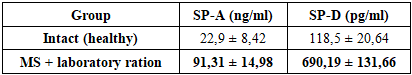 Normally, SP-A plays a role in lung immunity, phagocytosis of microbes, and inhibition of inflammation, but the level of antibodies to this protein was 4 times higher in rats with MS than in intact rats. This indicates the onset of inflammation, damage, and fibrosis in the lungs.SP-D in normal amounts performs antimicrobial protection, regulation of apoptosis, anti-inflammatory, and anti-fibrotic functions. The level of antibodies to the SP-D protein was ~5.8 times higher than in intact animals, and this result indicates the development of very severe inflammation and damage in the alveoli.