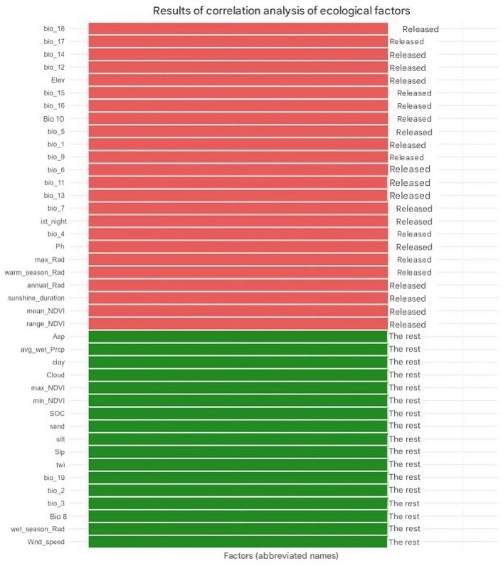 As the subject of the study, one of the rare, narrowly endemic species of the legume family (Fabaceae) was chosen Astragalus knorringianus Boriss. a perennial, nearly stemless, gray-green, closely pubescent herbaceous plant, 5–10 cm tall, hemicryptophyte. The leaves are 2–5 cm long, imparipinnate. The leaflets are arranged in 7–9 pairs, linear or linear-lanceolate, 5–11 mm long and 0.5–1.5 mm wide. Flower stalks are 2–5 cm long. There are 2–3 light yellow flowers. The standard is 32–37 mm long, and the calyx is 17–20 mm long. The pods are linear, closely covered with white and black hairs, up to 7 cm long and 4 mm wide, with a short beak. It blooms from March to April and bears fruit from May to June. It reproduces by seeds. It is distributed in the northwestern spurs of the Pamir-Alai (the Nurata, Turkestan, and Malguzar ranges). It grows on finely earthy, rocky, and gravelly soils, in the foothills, the lower and middle mountain belts, at elevations ranging from 497 to 1,728 meters above sea level.In this study, for the first time, the method of bioclimatic modeling using the BIOCLIM software package was applied to determine the ecological niche and potential distribution range of Astragalus knorringianus within the Nurata Reserve. The BIOCLIM program approximately defines the bioclimatic contour and summarizes the climatic conditions in the specified areas [13]. The indicators obtained from the GEE platform were processed to achieve a spatial resolution of 1 km. In the study, based on the SRTM digital elevation model, a number of topographic indicators were obtained that characterize the features of the terrain (elevation above sea level, slope, aspect, as well as the topographic wetness index) [14]. The Terra Climate dataset covers a range of variables reflecting environmental and climate parameters, based on regular measurements of relevant data. Annual solar radiation, maximum solar radiation, and sunshine hours were selected as such variables. Since most satellite data with long time series are characterized by low spatial resolution, inconsistent accuracy, and lack of comparability, the CHIRPS dataset [15] was used in this study. Atmospheric parameters such as cloud cover, wind speed, and surface temperature were taken from ERA5-Land [16]. Soil parameters were downloaded from the SoilGrids database [17]. From the WorldClim v2.1 database, among 19 bioclimatic variables, bio_2, bio_3, bio_8, and bio_19 were selected [18]. To identify the main ecological factors shaping species habitats, a Principal Component Analysis (PCA) was conducted. This analysis makes it possible to reduce the correlation between numerous ecological variables and determine their principal directions of influence [19].Selection of environmental variables and the BIOCLIM modelIn this study, 41 environmental variables and the occurrence points of Astragalus knorringianus were introduced into the BIOCLIM model. In the correlation analysis, the relationships among the 41 variables were assessed using the Pearson coefficient. As a result of this assessment, 24 variables with high correlation (r ≥ |0.7|) were excluded, leaving 17 factors with low intercorrelation for modeling. The remaining factors (bio_2, bio_3, bio_8, bio_19, wet_season_Rad, SOC, sand, silt, clay, twi, Slp, Asp, Cloud, Wnd_speed, avg_wet_Prcp, min_NDVI, max_NDVI) provide independent ecological information for the accurate and reliable assessment of the species' ecological niche through bioclimatic modeling (Figure 1). | Figure 1. Selected environmental variables for the BIOCLIM model |