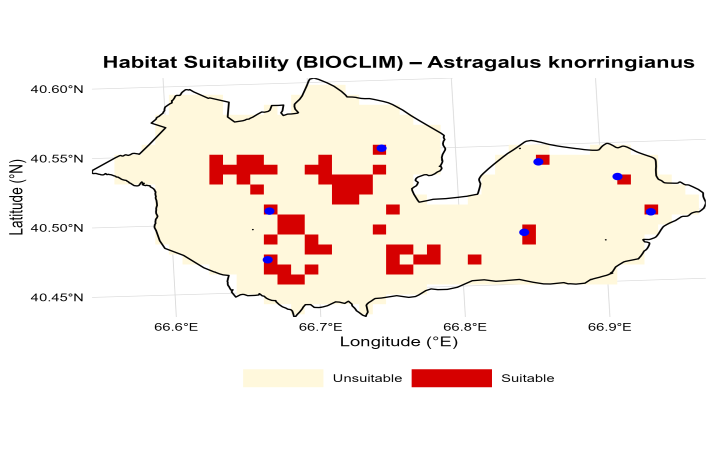 Plants are of key importance to life on Earth and are integral components of ecosystems. At the same time, anthropogenic pressure on the plant world continues to intensify globally, resulting in the process of biodiversity loss reaching catastrophic proportions. Another global factor threatening biodiversity is climate change. Currently, due to the cumulative impact of anthropogenic and climatic factors, many endemic and stenotopic species have become endangered [1,2,3]. In this regard, targeted research into the ecology and biology of narrowly distributed endemics and the phenomenon of endemism as a whole represents a pressing scientific issue [4,5,6]. One of the most modern methods is the identification of bioclimatic niches for rare and vulnerable species, the determination of ecological factors influencing the distribution of these species, and the assessment of potential species responses to climate change using computer modeling [7,8].The Nurata State Nature Reserve is located in the northwestern foothills of the Pamir-Alay mountain system, in the central part of the Nurata Range. The current area of the reserve is 22.18 km², and together with the buffer zone, the total area under study is 380.83 km². The central part of the Nurata Range, including the territory of the reserve and its buffer zone, is an internationally recognized key biodiversity area within the Central Asia Mountains Global Biodiversity Hotspot [9,10]. This region is rich in rare and endemic species, with a flora endemism rate of 2.7% [11]. In this regard, the Nurata Reserve is of great importance for the conservation of biological diversity in the Republic of Uzbekistan, including many endemic, rare, and endangered plant species.In this study, based on the BIOCLIM model, the potential distribution range of Astragalus knorringianus Boriss. a rare endemic of the North-Western Pamir-Alai, listed in the Red Book of the Republic of Uzbekistan with status 2 [12] was analyzed within the territory of the Nurata State Nature Reserve. The environmental factors favorable for this species have been identified.