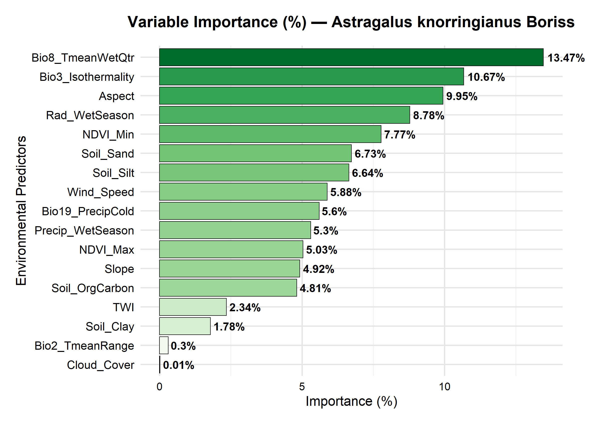 The most favorable habitats are mainly located on slopes of moderate steepness with south-western and western exposure. The actual occurrence points of the species (blue dots) closely match the suitable habitats predicted by the model, indicating a high level of model accuracy (Figure 2).Analysis of Environmental FactorsAccording to the results obtained using the BIOCLIM model, the spatial distribution of Astragalus knorringianus is most influenced by factors primarily related to the climatic and topographical groups. A total of 17 environmental factors were analyzed, among which the following were found to be the most significant:1. The most important factors: Bio8_TmeanWetQtr (13.47%) – the average temperature of the wettest quarter is the factor exerting the greatest influence on the distribution of this species. This indicates that the species actively develops under moderately warm and moderately humid conditions during the spring-summer period. Bio3_Isothermality (10.67%) – the ratio of daily to annual temperature variation points to the species’ sensitivity to temperature stability. The species is resilient to sharp temperature fluctuations, but demonstrates optimal growth in consistently warm conditions. Aspect (9.95%) – the exposure of the terrain determines the amount of sunlight. The species is predominantly found on sunny, warm southern and southwestern slopes. Rad_WetSeason (8.78%) – solar radiation during the wettest season, as a factor enhancing the process of photosynthesis, increases plant biomass. NDVI_Min (7.77%) – the minimum vegetation index reflects the ability of the species to retain green biomass even during dry periods, which indicates good adaptation to the arid conditions of the region.2. Moderately important factors: Soil_Sand (6.73%) and Soil_Silt (6.64%) – the mechanical composition of the soil plays an important role in the development of the species’ root system and its water permeability. This species prefers to grow on sandy and light loamy soils, that is, on well-drained substrates. Wind_Speed (5.88%) – wind speed contributes to the natural dispersal of seeds and the formation of the microclimate. Bio19_PrecipCold (5.6%) – the amount of precipitation during the coldest period affects the species’ winter dormancy, but its overall significance is relatively low.3. Minor factors: Cloud_Cover (0.01%) and Bio2_TmeanRange (0.3%) – the influence of these factors is very low, as the species is adapted to sunny regions with sharp temperature fluctuations. Soil_Clay (1.78%) and TWI (2.34%) – factors associated with moisture accumulation – have relatively little significance, since the species is adapted to living in dry conditions (Figure 3). | Figure 3. The influence of environmental factors on the distribution of Astragalus knorringianus |