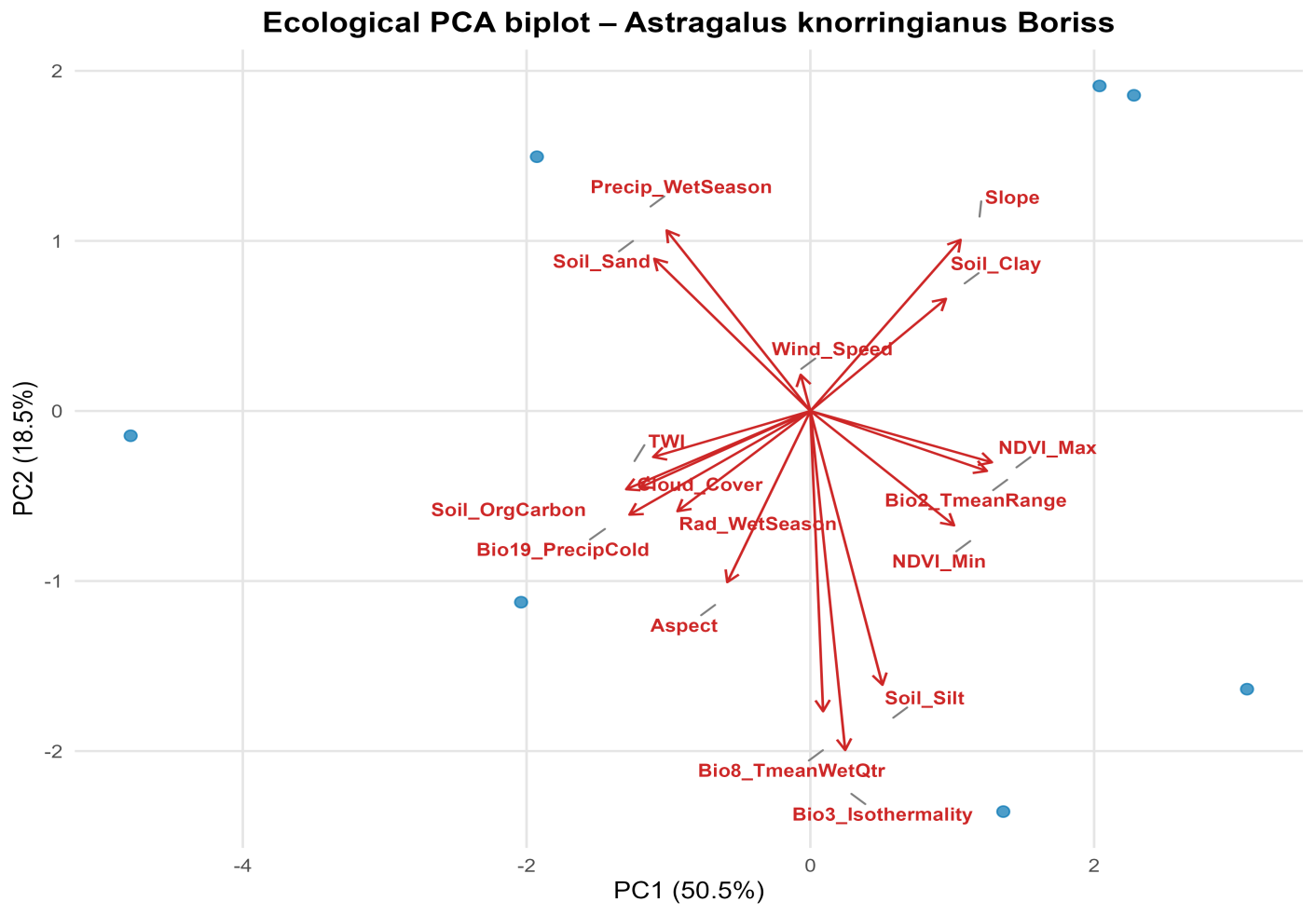 Ecological interpretationThe results obtained show that Astragalus knorringianus is a xerophytic species adapted to semi-desert foothill ecosystems, to dry open habitats with high insolation, good ventilation, high temperatures, and relatively low precipitation. The optimal living conditions for this species are sunny southern slopes.The onset and active phase of vegetation in the species are associated with the moist and warm spring period (Bio8_TmeanWetQtr).These results show that the narrow geographic range of Astragalus knorringianus is due to its limited ecological tolerance, while the species is highly adapted to its habitat. The small distribution area and narrow ecological niche indicate that climate change and human activities (such as livestock grazing, construction, and erosion) may pose a serious threat to the natural populations of this species.PCA – Principal Component AnalysisAs mentioned above, as a result of the Pearson correlation calculation for 41 environmental factors, 24 highly correlated variables were excluded (including Bio1, Bio4, Bio12–Bio18, Elev, pH, annualRad, sunshine_duration, meanNDVI, and others). Thus, the following 17 factors were used for PCA:Climatic factors: Bio2 (mean diurnal temperature range), Bio3 (isothermality), Bio8 (mean temperature of the wettest quarter), Bio19 (precipitation of the coldest quarter), Wet_season_Rad, Wind_speed.Topographic factors: Aspect (exposure), Slope, TWI (topographic wetness index).Soil factors: SOC (soil organic carbon content), Clay, Sand, Silt.Factors related to vegetation and cloud cover: NDVI_min, NDVI_max, Cloud, Avg_wet_Prcp.This approach made it possible to reduce multicollinearity and simplify the ecological interpretation of the PCA results. The components obtained through PCA reflect the main ecological gradients of the species’ niche that is, they enable visual analysis of the factors that have the greatest influence on its growth [19].According to the results of the PCA, the first two principal components (PC1 and PC2) explain 69% of the total variance: PC1 accounts for 50.5%, and PC2 for 18.5%. PC1 mainly shows a positive correlation with the variables NDVI_Max, Wind_Speed, Slope, and Soil_Clay, which indicates the species’ adaptation to frequent strong winds, soil density, and steep terrain. PC2 is associated with the influence of Precip_WetSeason and Soil_Sand, reflecting wet conditions and sandy soils. The species’ position on the biplot is located near the vectors Slope, Wind_Speed, and NDVI_Max. This indicates its adaptation to growing on dry, open, and well-lit slopes under strong winds. Its opposite orientation with respect to the vectors Soil_OrgCarbon and Bio19_PrecipCold confirms the species’ distribution on poor soils with low organic content and in conditions with little precipitation (Figure 4). | Figure 4. PCA analysis of Astragalus knorringianus |
