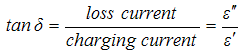 A (mm²) is the area of the sample, d is the thickness of the sample.In an ideal electrical circuit having condenser, the charging current is 90° out of phase with applied voltage. In vector notation the total current is the sum of charging current and loss current. The angle δ between the vector for the amplitude of total current and that for the amplitude of charging current is known as the loss angle. The tangent of the loss angle can be expressed as | (3) |