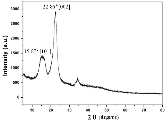 The XRD spectra in Figure 1 confirms the removal of hemicelluloses and lignin from the treated LC fibers. The treated LC fibers contain only celluloses. However the treated LC cellulose fibers are partly crystalline and partly amorphous in nature. The peak at 15.87° in Figure 1 corresponds to amorphous cellulose or cellulose II of [101] crystallographic plane and the peak at 22.86° correspond to crystalline cellulose [cellulose I] of [002] crystallographic plane [14]. The removal of hemicelluloses and lignin from the LC fiber increases the hydrophobicity and explores the possibility of controlling the dielectric response of composites when it is reinforced.