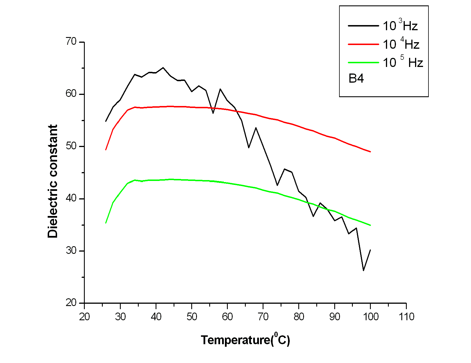 | | Sample | Dielectric constant | | At 103 Hz | At 104 Hz | At 105 Hz | At 106 Hz | | B1 | 116.66 | 75.24 | 57.29 | 46.46 | | B2 | 126.66 | 81.24 | 53.29 | 39.46 | | B3 | 47.46 | 43.29 | 29.46 | 23.46 | | B4 | 57.46 | 53.29 | 39.46 | 33.46 | | B5 | 87.46 | 70.71 | 50.09 | 36.49 |
