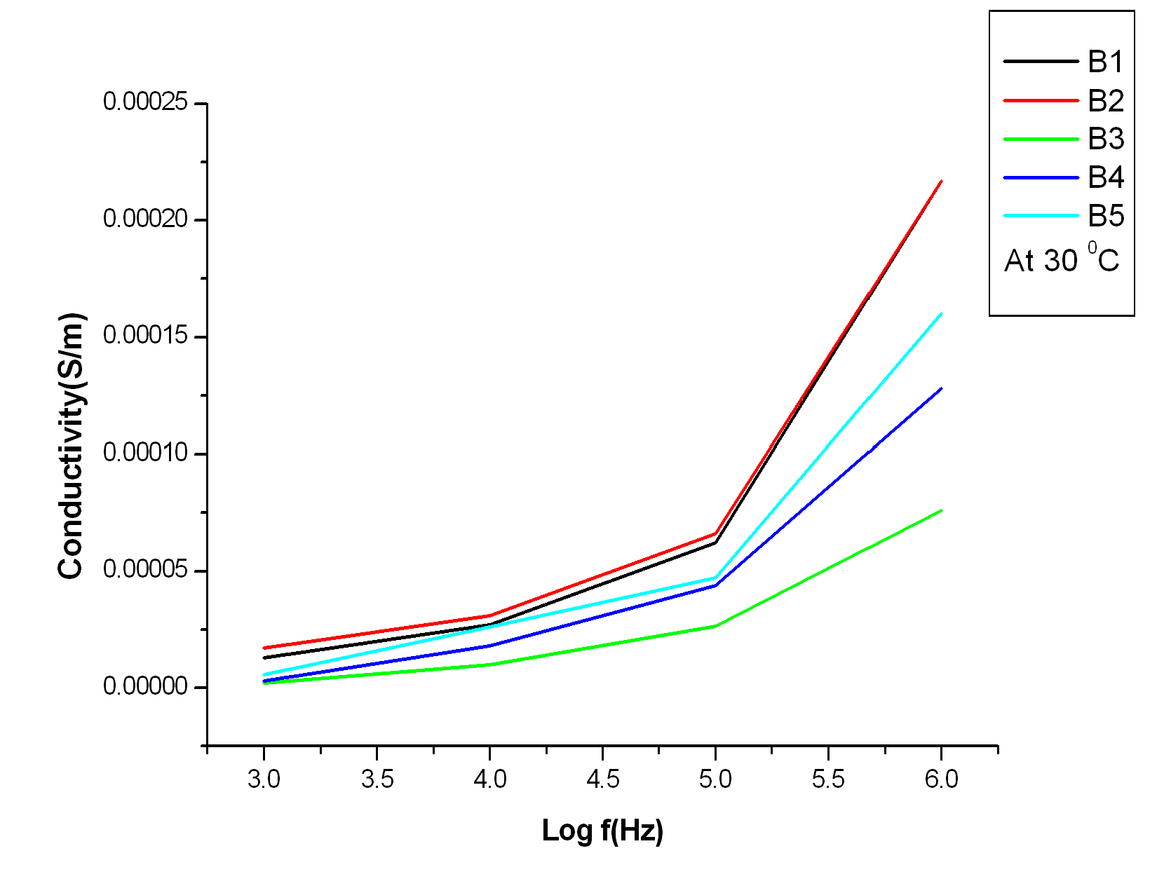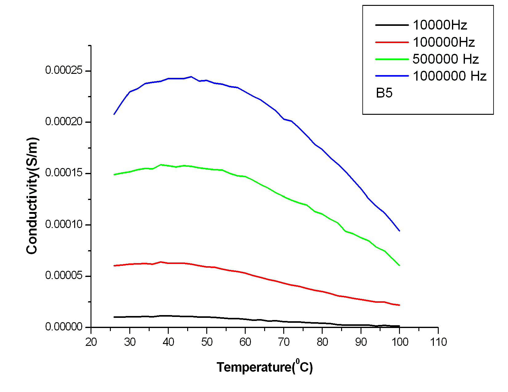| | Sample | Conductivity (Si/m) (x 10-5) | | At 103 Hz | At 104 Hz | At 105 Hz | At 106 Hz | | B1 | 1.28 | 2.70 | 6.22 | 21.7 | | B2 | 1.70 | 3.10 | 6.61 | 21.7 | | B3 | .20 | .98 | 2.64 | 7.60 | | B4 | .317 | 1.80 | 4.39 | 12.8 | | B5 | .580 | 2.60 | 4.73 | 16 |