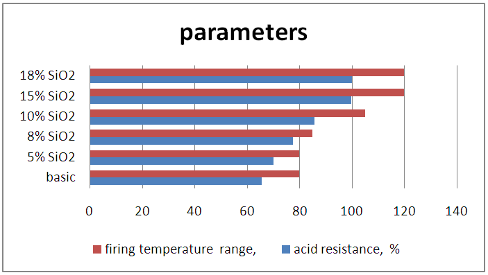 The determination of the optimum ratio of active cations in enamels made it possible to obtain coatings, which service and technological parameters meet the requirements imposed on inner protective coatings for steel pipelines.Such properties of enamel as high resistance to the effect of aggressive media, wide firing interval are formed by addition of filler (marshallite (SiO2) and other) (Fig.1). | Figure 1. Dependence of acid resistance and firing temperature range of glass covers on filler content |