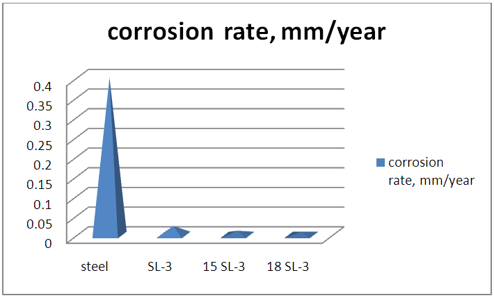 Results showed that adding of marshallite in the slip’s composition with a dosage up to 15-18% not only increases corrosion resistance of enamels by 35-40% and the firing temperature range expanding up to 120, but also changes the mechanical properties of glass-coatings and increases the impact strength up to 5,1-5,6 j (further 15 SL-3 and 18SL-3 are the coatings with addition of 15% and 18% marshallite).Experimental tests of obtained coatings on hydrosulphuric corrosion have shown positive results. The application of the basic SL-3 coating (without mineral filler) on steel by at least one order of magnitude reduces the corrosion rate of steel samples in hydrosulphuric solution. Corrosion rate in the case of 15SL-3 and 18SL-3 coatings decreases from 0,4 mm/year to 0,011 and 0,008 mm/year (Fig.2). | Figure 2. Decrease in corrosion rate of enamel coatings compared to the initial value of steel samples |