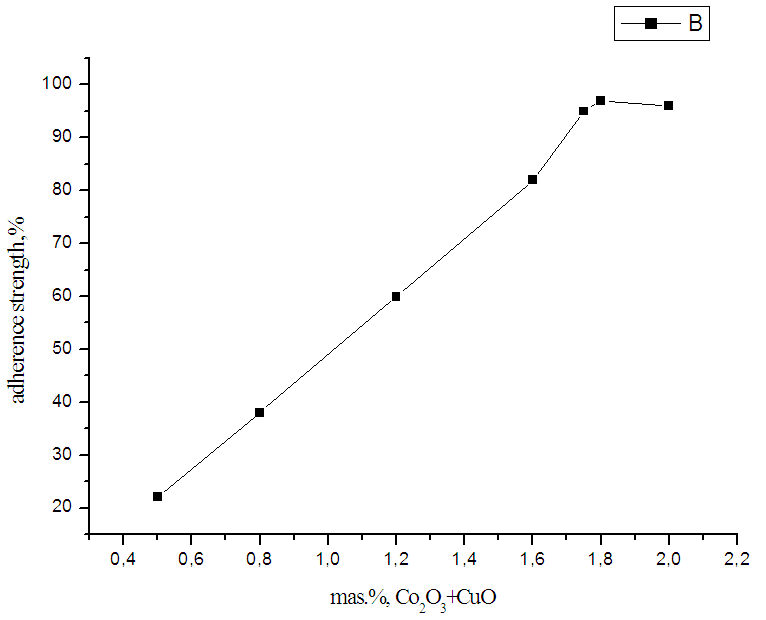 After test the adhesion of one coat enamel to metal, which is one of the important properties of corrosion prevention coatings, remained at baseline values. Impact strength also has not changed, before and after the experiment is within 5,1-5,6 j, compressive strength - 1500-1600 MPa. The mechanical properties and corrosion rate are influenced by the adhesion of coatings to the steel surface. We can conclude from measuring series the best result of bending test (more than 95%) according to EN 10209 [4] is observed when the integrated content of Co2O3 and CuO oxides in an amount 1.8 mass % (stable adhesion presented in the case e.g. of 15 SL-3 glass coating). In fact, the adhesion at enamel/steel interface increases with a heightening of adherence agents’ concentration and has reached maximal magnitude at the joint content 1.8 mass %. That means that this optimal concentration of special adherence promoter increases the reaction activity of copper containing melts on steel, helps to improve the conditions of wetting and allows active interaction in the contact zone. | Figure 3. Effect of promoter oxides on adherence strength of enamel 15 SL-3 to steel |