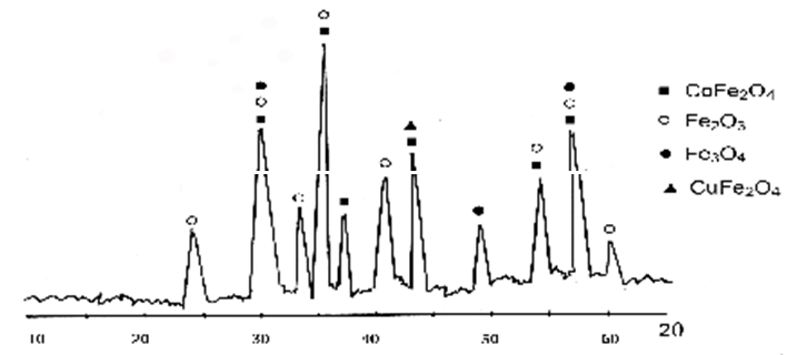 It is known, that adherence of coatings to the metal substrate is the result of a complex physicochemical process depending on a combination of many factors [4, 8, 9]. Further studies are underway to better understand the coatings forming mechanism on steel substrate and to develop a more effective protection against corrosion of one-coat enamels in service.The metallographic study of enamel / steel interface established that during firing as a result of the formation of new products and diffusion processes is formed a transitive layer approximately 20-22 µm thick. X-ray pattern performed at the phase boundary reveals the presence of ferrites and iron oxides as the main phases (Fig. 4). The crystallization of CoFe2O4 and CuFe2O4 ferrites is due to the fact that adherence activators interact with Fe2O3 (FeO). The boundary layer in almost all samples contains spinels, which can provide a stable adhesion of enamel to metal. | Figure 4. X-ray investigation of the boundary layer |