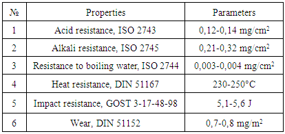 The presence of iron oxides – hematite (Fe2O3) and magnetite (Fe3O4) at contact layer is due to a thermally induced oxidation of wustite (FeO) upon firing. The iron oxides dissolve in the glass melt and thereby could also favor the adhesion. It should be noted that with increasing contact time increases the migration of metal cations to the interface enamel / metal. This diffusion process has a favorable effect on the adhesion of the glassy phase to steel.Thus, the stable adherence of the enamel layer leads to durability of finished product, including chemical, mechanical, heat resistance and resistance to abrasion. The results of complex tests of steel samples coated with obtained single-layer coatings for their compliance with the specifications are presented in Table 1.Table 1. Parameters of Pipe Glass Coatings  |